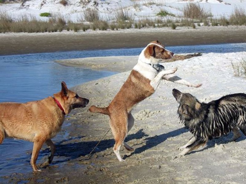 Anything in the yard is fair game; balls, bones, sticks, firewood, rawhide chews, tree bark, roots, inadvertently left out shoes, toys, tools, cans, etc. Living on the coast Kayla and the other dogs get to spend some quality time at the beach and along Santa Rosa Sound. She is definitely a water-dog. It doesn't matter what the temperature is she will get in the water. No mud puddle is off limits! If the other dogs walk around it, she will walk through it (and then stop to get a closer look or a drink).